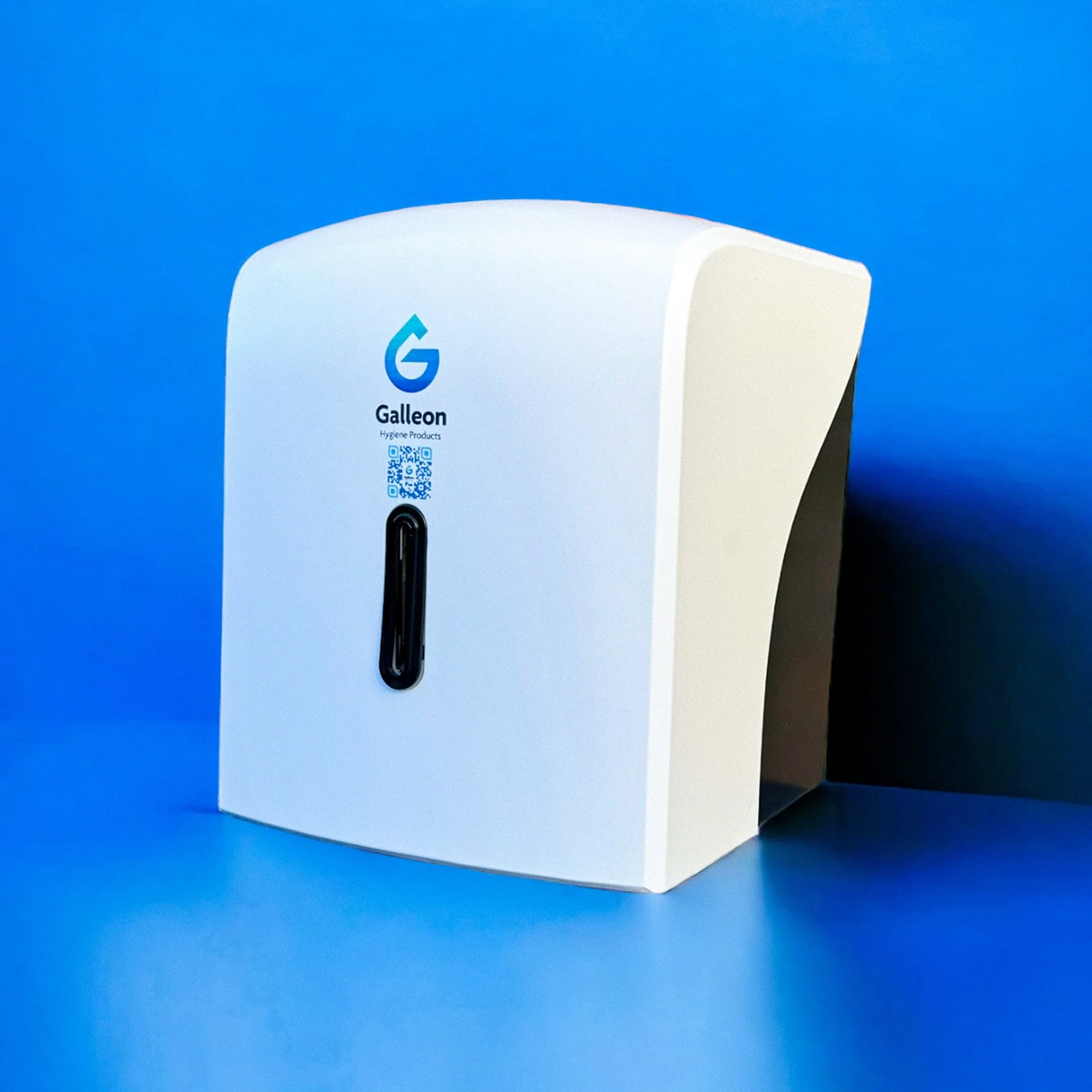 A universal centrefeed roll dispenser unit in white – attractive modern ABS plastic construction makes it remarkably hardwearing for a longer product life.
